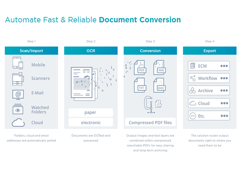 The IRISXtract™ Document Converter Solution is a fully scalable and modular application that automatically converts your documents into fully searchable and hyper-compressed files adapted for editing and long-term archiving. Output documents are routed to the archiving or back-end system of your choice, for fast and easy access.