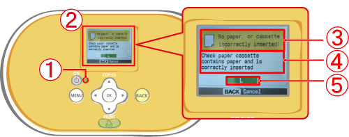 | No paper, or cassette incorrectly inserted! | - Check that the paper cassette is firmly inserted all the way into the printer. - If the paper is not feeding correctly into the printer, remove the paper cassette and any paper left in the printer. |