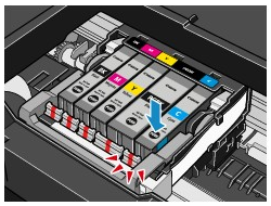 (Push) on the ink tank until the ink tank snaps firmly into place.Make sure that the ink lamp lights up red.