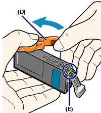 (2) Hold the orange protective cap (D) as indicated in the figure below, then twist and remove it from the bottom of the ink tank.