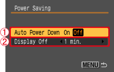 - When you set [Auto Power Down] to [Off], the power saving function will not operate, so please make sure to turn the power off.