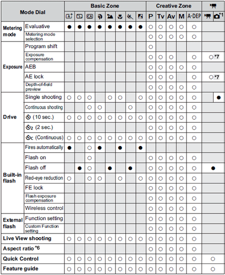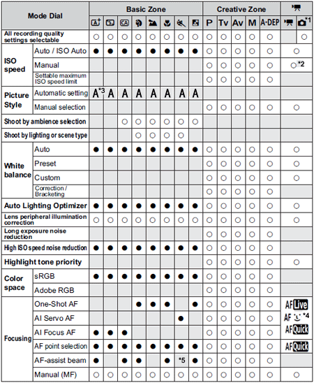 List of functions that can be set in each shooting mode (EOS REBEL T3i/EOS 600D)