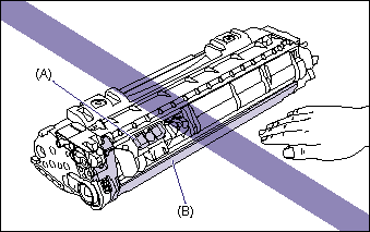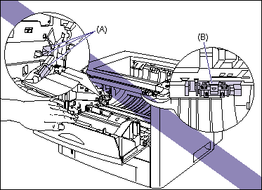 b. Be sure not to touch the high-voltage contacts (A) or electrical contact (B) shown in the figure, as this may result in damage to the printer.