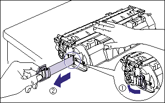 5. Place the toner cartridge on a flat surface, fold back the tab of the sealing tape (1), and then pull out the sealing tape (approx. 45 cm long) gently (2) while supporting the toner cartridge.