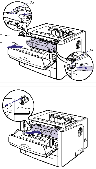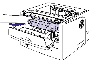 5. Push the toner cartridge into the printer until it touches the back of the printer while aligning (A) on both sides of the toner cartridge with the toner cartridge guides inside the printer.