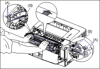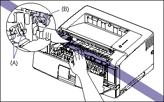 e. Do not touch the high-voltage contact (A) or the electrical contact (B) shown in the figure, as this may result in damage to the printer.