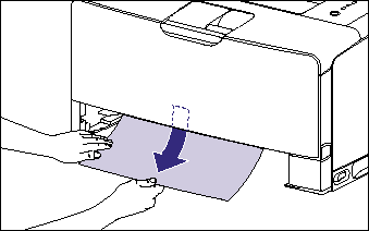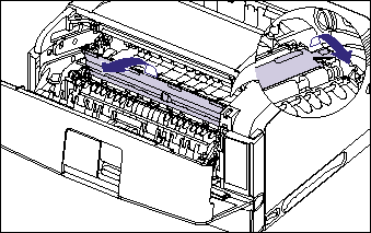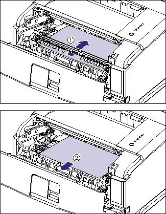 Send the top edge of the jammed paper out of the transport guide (1), then remove the paper in the direction of the arrow gently (2). Remove the jammed paper in the direction of the arrow gently to prevent unfixed toner from spilling.