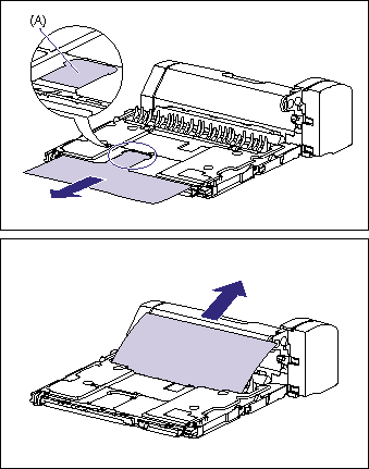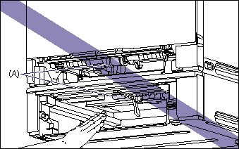 If you see the jammed paper in the area of (A), pull out the paper toward you to remove it.
