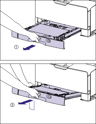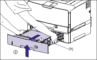 Hold the grips (A) with both hands, raise the front side of the paper cassette slightly (2), and then pull it out completely (3) as shown in the figure.