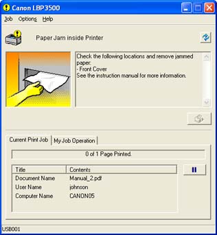 The Paper Jam indicator (orange) blinks, and the following messages appear in the Printer Status Window when a paper jam occurs during printing.