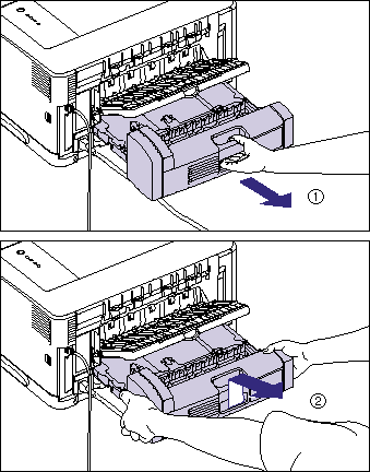 - Pull out the duplex unit gently until it stops (1), then raise the front side of the duplex unit and remove it from the printer unit (2).