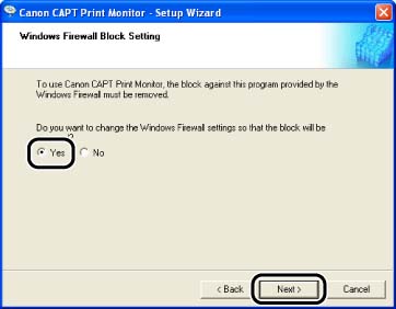 If you are using Windows XP Service Pack 2 or another operating system equipped with Windows Firewall, and when the following screen appears, select [Yes], and then click [Next].