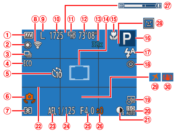 ![]() | Battery level | ![]() | Shooting mode, Scene icon |