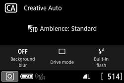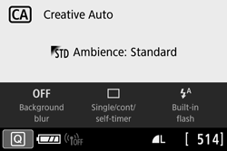 In Creative Zone modes, when [Guided] is set, only the functions particular to the set shooting mode are displayed on the Quick Control screen. Note that items that cannot be set from the Quick Control screen when [Guided] is selected can be set via the menu screen.