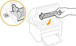 Do not shake or tilt the drum cartridge. Also, make sure to avoid applying shocks to the drum cartridge, such as by hitting it against something. Doing so may cause the toner left in the drum cartridge to leak. Remove the drum cartridge gently at the same angle as the slot.